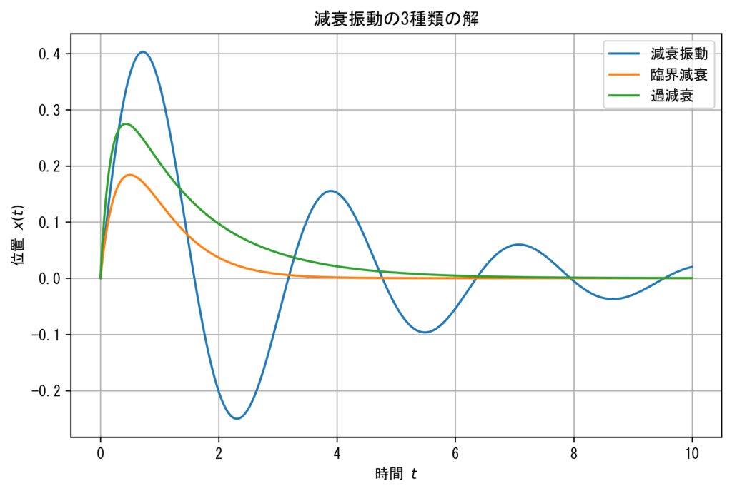 抵抗力が大きくなり、臨界減衰と過減衰の振る舞いになると、もはや振動はせず、ゆっくりと\(x=0\)に減衰していく様子が読み取れます。